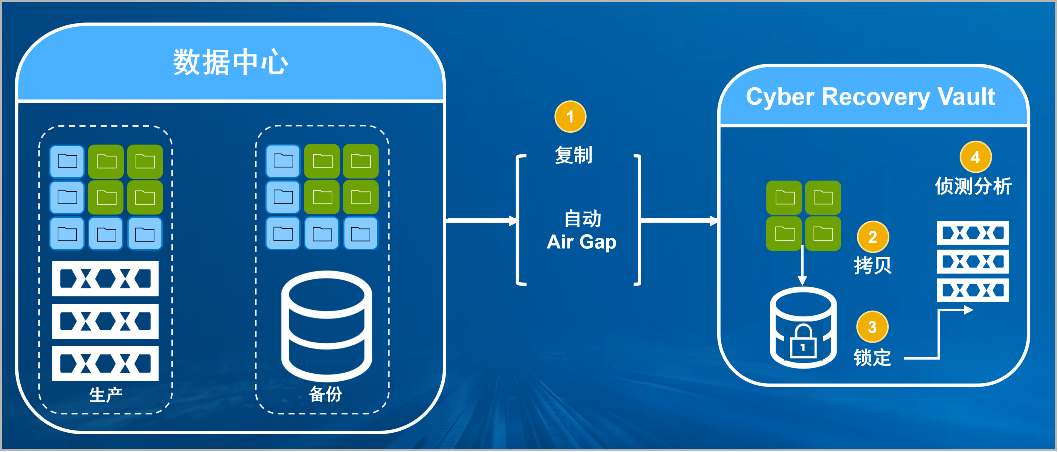 AG庄闲防勒索病毒方案将生产中心备份数据复制到Vault区,复制后网络自动断开实现弹性隔离。Vault区的数据快速拷贝,并对拷贝版本加锁(在锁定期数据不允许删除和修改)。Vault沙箱内对拷贝版本进行扫描分析,验证数据是否完好。